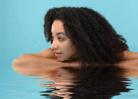 Beautiful woman with perfect skin against light blue background. Her reflection in rippled water