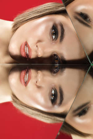 Glowing. Portrait of young female fashion model with reflection on mirrors around her face. Beautiful caucasian woman with trendy make-up and well-kept skin. Style and beauty concept. Close up.