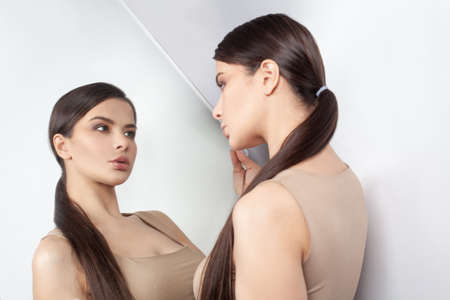 young beautiful girl looking in the mirror, a reflection of the different emotions,white bed in the background