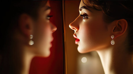 A striking portrait of an elegant woman showcasing sparkling earrings, highlighting beauty and grace against a softly illuminated background.