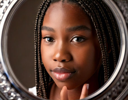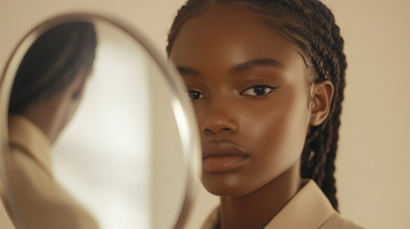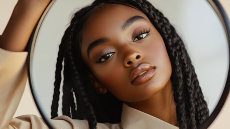 A young woman with dark skin and braided hair gazes thoughtfully into a softly blurred round mirror. Her glowing skin and calm expression reflect the serene atmosphere of the softly lit background.