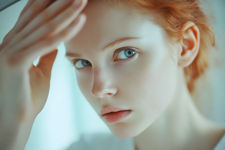 Close-up of a young woman with red hair and blue eyes, gently touching her forehead, highlighting her natural beauty and the soft ambiance of the indoor setting