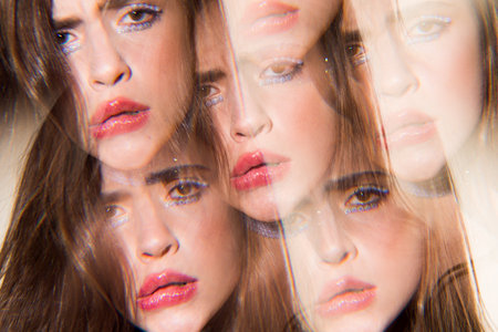 On the water. Portrait of young female fashion model with reflection on mirrors around her face. Beautiful caucasian woman with trendy make-up and well-kept skin. Style and beauty concept. Close up.