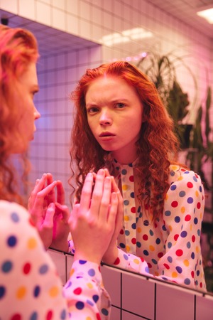 Fashion portrait of serious young redhead curly lady standing in cafe. Standing near mirror. Looking at camera.