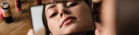reflection in side view mirror of young woman applying lip gloss on blurred foreground, banner
