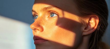 Close Up Portrait of a Young Woman with Freckles in Partial Sunlight, Beauty and Skincare Concept