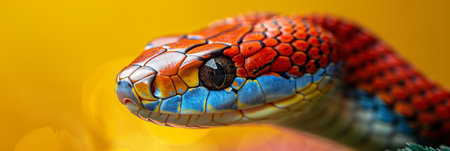 Close up of a vibrant, colorful snake showcasing intricate scales and mesmerizing eyes, perfect for nature photography enthusiasts and wildlife lovers
