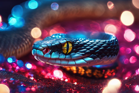 Close-up view of a green snake resting among colorful bokeh lights at night in a vibrant setting