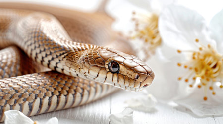 A stunning snake artistically intertwined with beautiful white blooms.