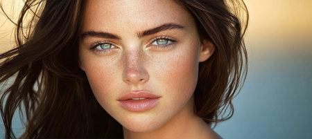 Portrait of a Beautiful Young Woman with Natural Makeup, Highlighting Clear Skin, Freckles on Face