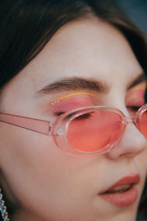 Portrait of a beautiful young woman with bright make-up in a colorful raincoat