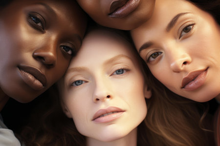 A captivating portrait of three diverse women with radiant skin, expressive makeup, and a modern aesthetic, illuminated by warm, soft light and vivid colors, emphasizing beauty, unity, and elegance.