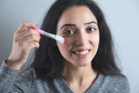 Beauty portrait of beautiful female model. Beautiful brunette caucasian young woman prepare herself, applying powder on her cheeks with a brush. Woman with beauty face, natural skin.