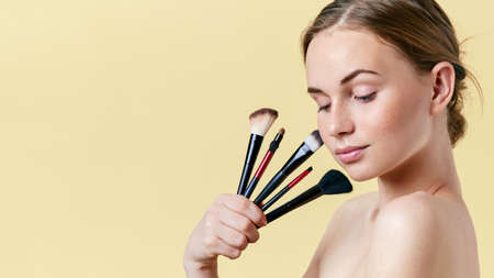 Pretty redhead teenage girl with freckles, looking down, holding diverse make up brushes. Model with light nude make-up. Studio beauty portrait on yellow background.