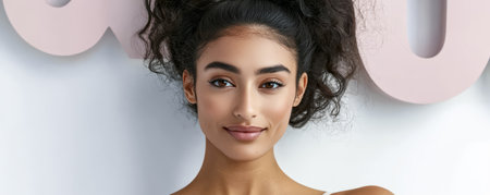 A young woman poses confidently with soft waves in her hair and captivating makeup. The neutral backdrop highlights her radiant complexion and striking features, perfect for a fashion shoot.