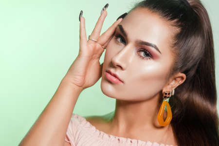 Beautiful girl with evening green makeup on green background. Eye make-up and sensual lips. Elegant hairstyle. Brunette with tassel bijouterie earrings. High fashion.