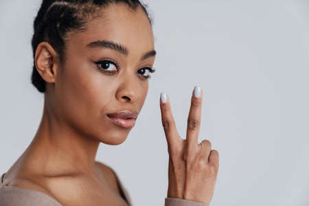 Beautiful african american woman showing peace gesture at camera isolated over white background