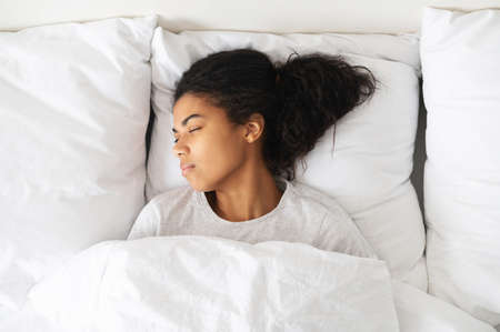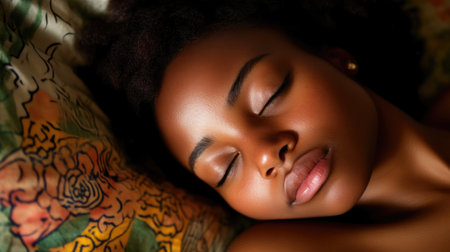 Close up of a young female with dark skin sleeping soundly in a cozy bed with soft light falling on her face