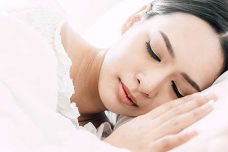 Portrait of beautiful Asian woman sleeping on bed in the morning.