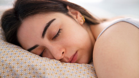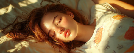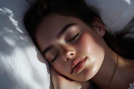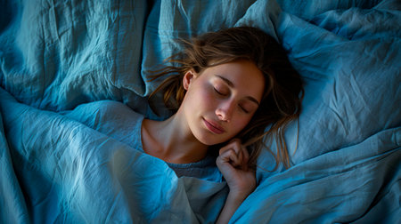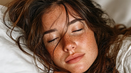 A young woman with closed eyes is resting peacefully in bed, embodying tranquility and relaxation amidst a soft indoor atmosphere perfect for self-care.