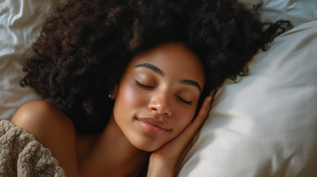 Smiling Woman with Curly Hair Sleeping Peacefully on a Pillow in Soft Light. High quality photo