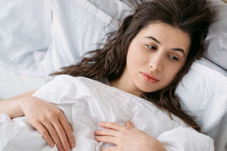 Morning melancholy. Weekend loneliness. Home depression. Pensive tired sad brunette woman lying in bed alone with white blanket.