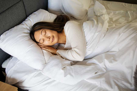 Healthy peaceful girl sleeping well in comfortable cozy fresh bed on soft pillow white linen orthopedic mattress, enjoy sleep at home, top view, dreaming, recuperating, dressed in nice stylish pajamas