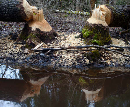 Detail of damaged trees by european beaver, castor fiber. Animal build his dam