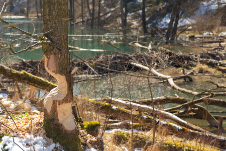A forest growing in the vicinity of beavers. Tree trunks felled by beavers. Early spring season.