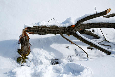 fallen tree cut by a beaver in the snowy scenery