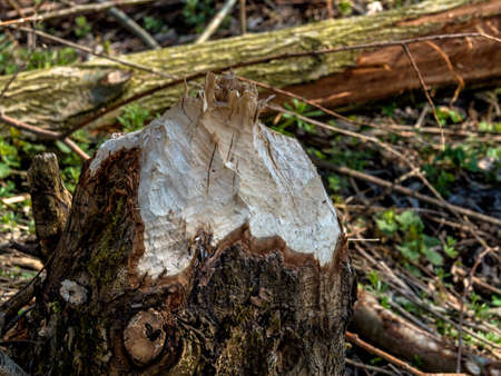 Work of a beaver in forest. A tree is gnawed off. It is typical for beavers to fell trees. Was seen in the nature park Nuthe-Nieplitz, Brandenburg.