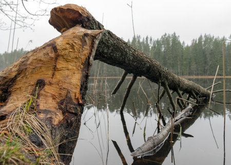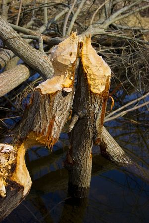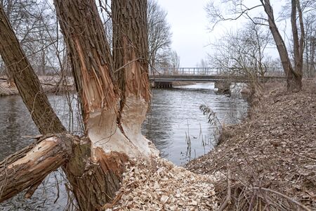 Beaver trees. Tree trunk gnawed, chewed, destroyed, carved, fallen, broken by European beaver Castor fiber close to the water. Evidence of beaver`s activity. Trees damaged by protected animal