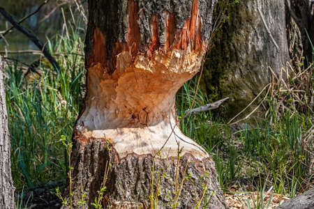 Marks afters beaver teeth on a tree trunk in wetland. Horizontal close-up composition on a tree growing on riverbank bitten from wild animal with green grass around.