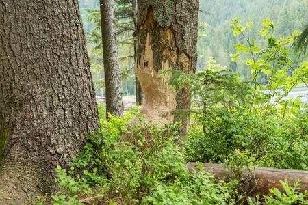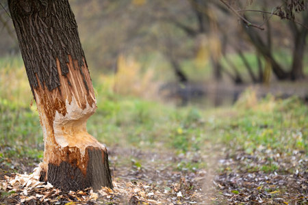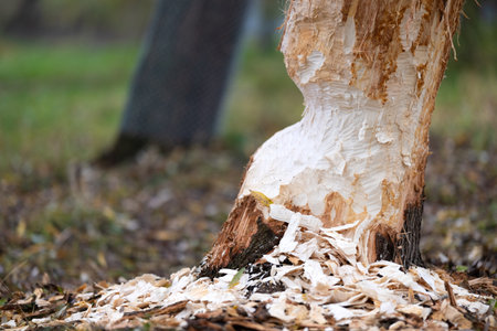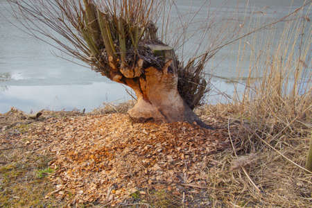 Tree gnawed through by beaver, wood chips around tree stump,photo of beaver damage
