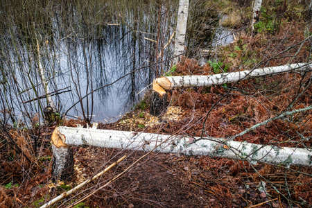 Traces of teeth on a birch that a beaver fell. Birch tree trunks fallen after beavers job on the lake shore