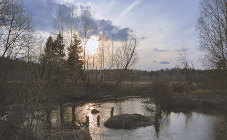 Beaver-made dams on a small river, dark gloomy picture, reflection in water, selective focus.