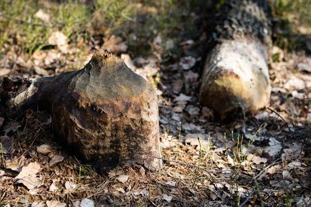 Detail of damaged trees by european beaver, castor fiber. Animal build his dam