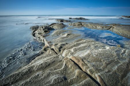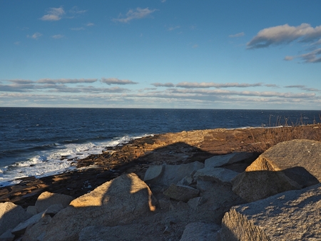 View of the rock ledges with the ocean in the background at sunrise in Pemaquid Point, Maine