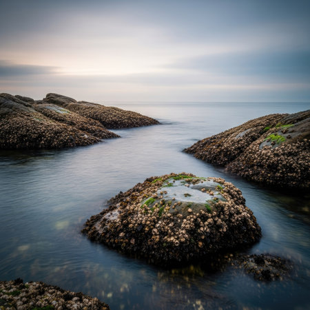 This image shows a coastal scene featuring rocks partially submerged in still water. The composition highlights the textures of the rocks and the serene atmosphere. The color palette includes muted tones, suggesting a cloudy day, or possibly dusk. It could be suitable for various editorial or commercial projects.