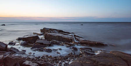 Beautiful sunrise on the shore of the White Sea with stones and seaweed at sunny morning Belomorsk, Karelia. Long exposure image