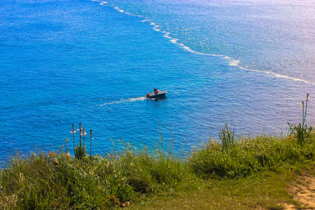 Green grass against a background of blue ocean in summer and a little boat on the horizont