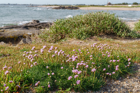 A beautiful shot of pink flowers by the sea on a sunny day in Britain