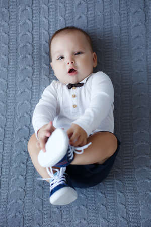 Sweet baby boy on the bed. Funny face of chubby child