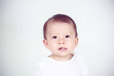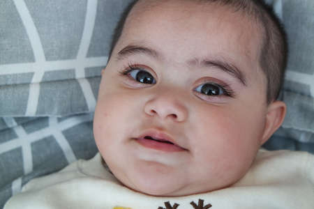 Cute little baby boy with the big brown eyes. Sweet infant at home