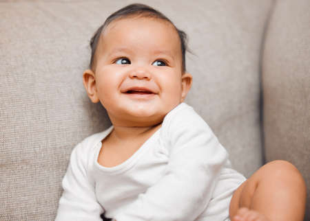 Portrait of a baby girl having fun in the living room sofa in a room,