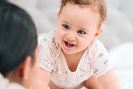 Adorable baby boy in white sunny bedroom plays alone lying on the bed.Charming beautiful lovely small female baby with plump cheeks creeps on bed, looks innocently on something, being naughty. Cute baby infant plays alone. Newborn kid crawls.