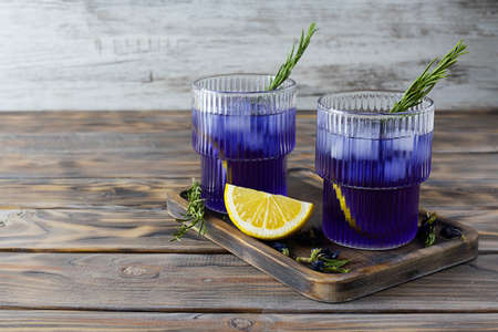 Two transparent glasses of cold blue tea on a wooden tray