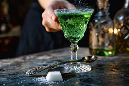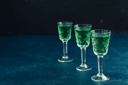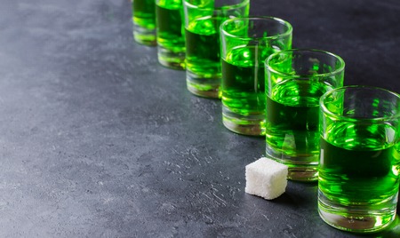 Alcoholic drink, creative stimulant and bohemian lifestyle concept theme with. green bitter wormwood tincture in glasses.