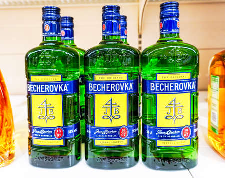 Samara, Russia - March 26, 2022: Becherovka herbal liqueur alcoholic beverage for sale in superstore. bottled alcoholic drinks and spirits