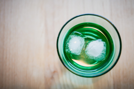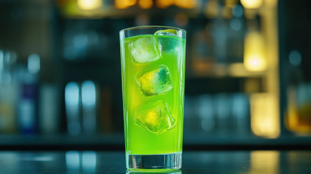 Glass of Bright Green Cocktail with Ice Cubes on Bar Counter in Nightclub Setting. High quality photo